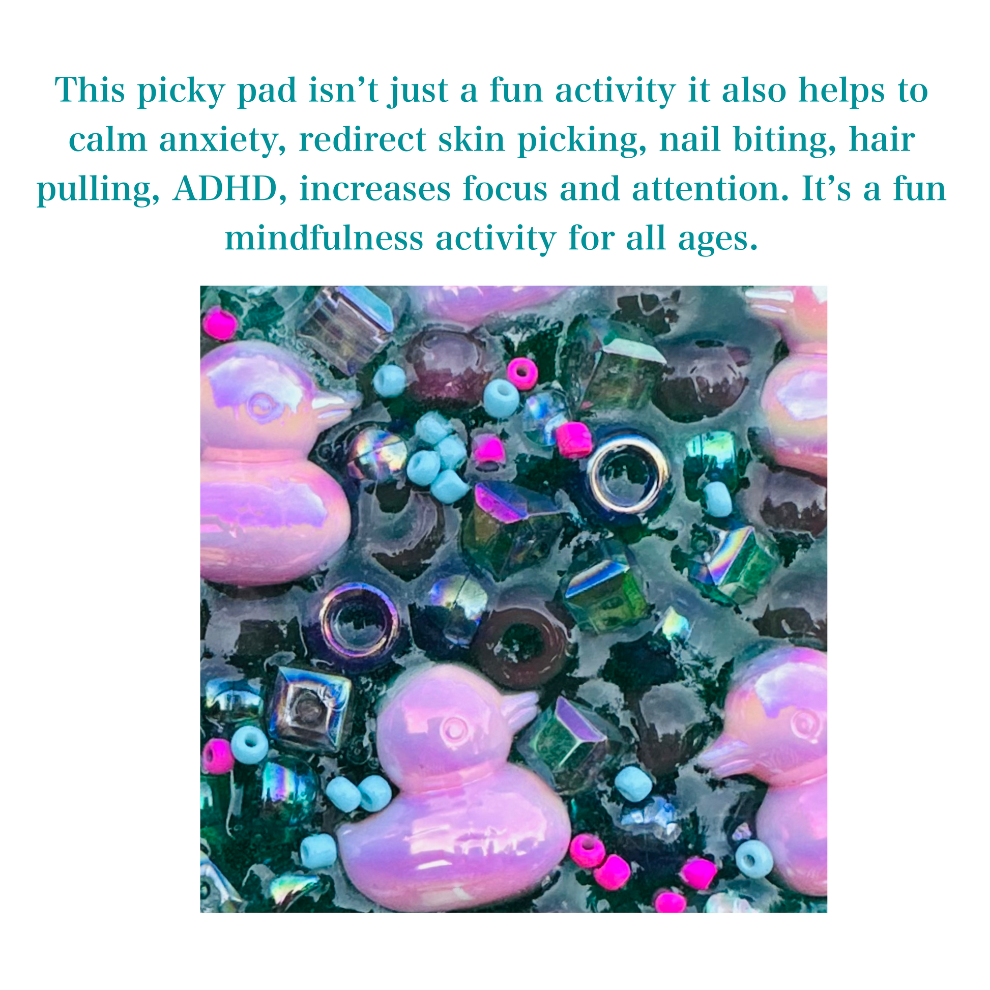 Handmade with love by Excellent Minds, this gel filled sensory pad is packed with fun beads and duck charms perfect for kids, teens and adults who need a moment of calm. This picky pad can be used over 100 times and comes with simple instruction.