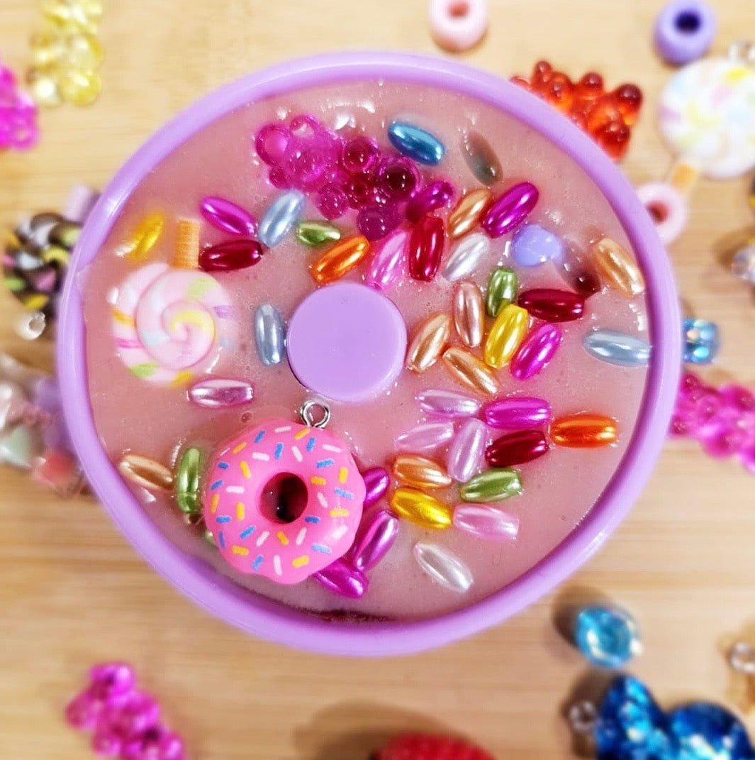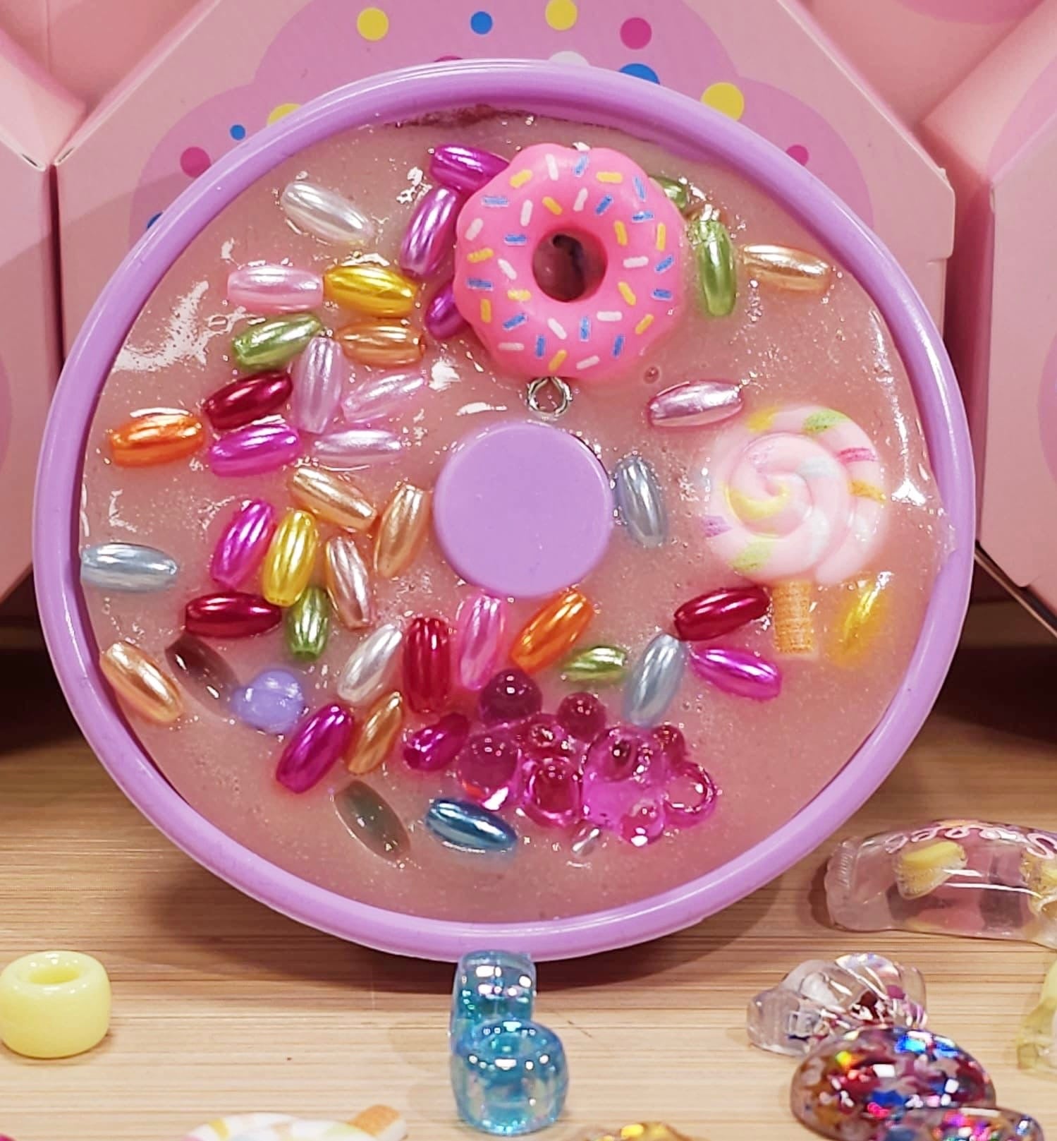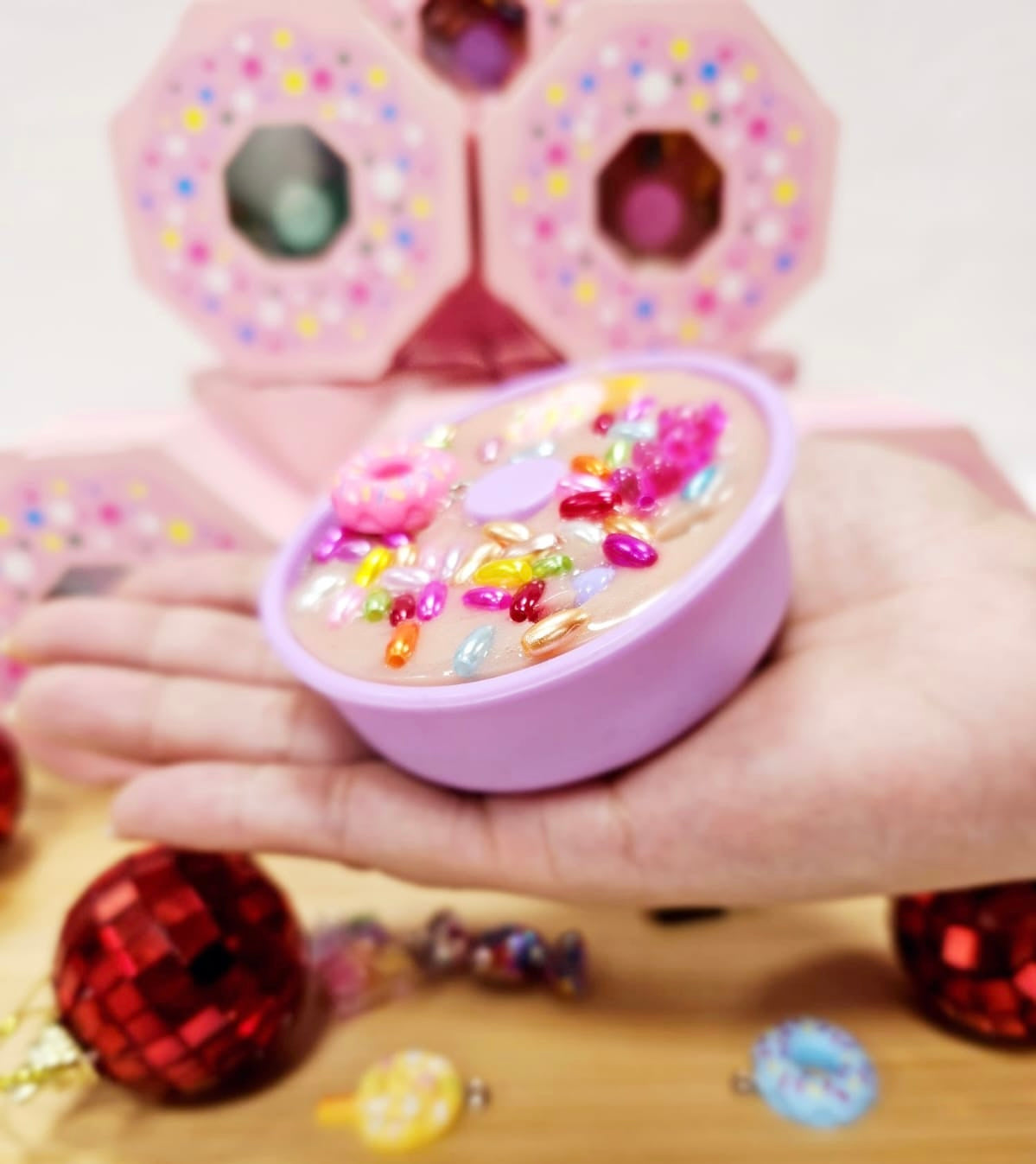 - Once the base is hard melt the icing gel in a microwave safe plate or cup. Pour it on top of the doughnut base and add your charms.
