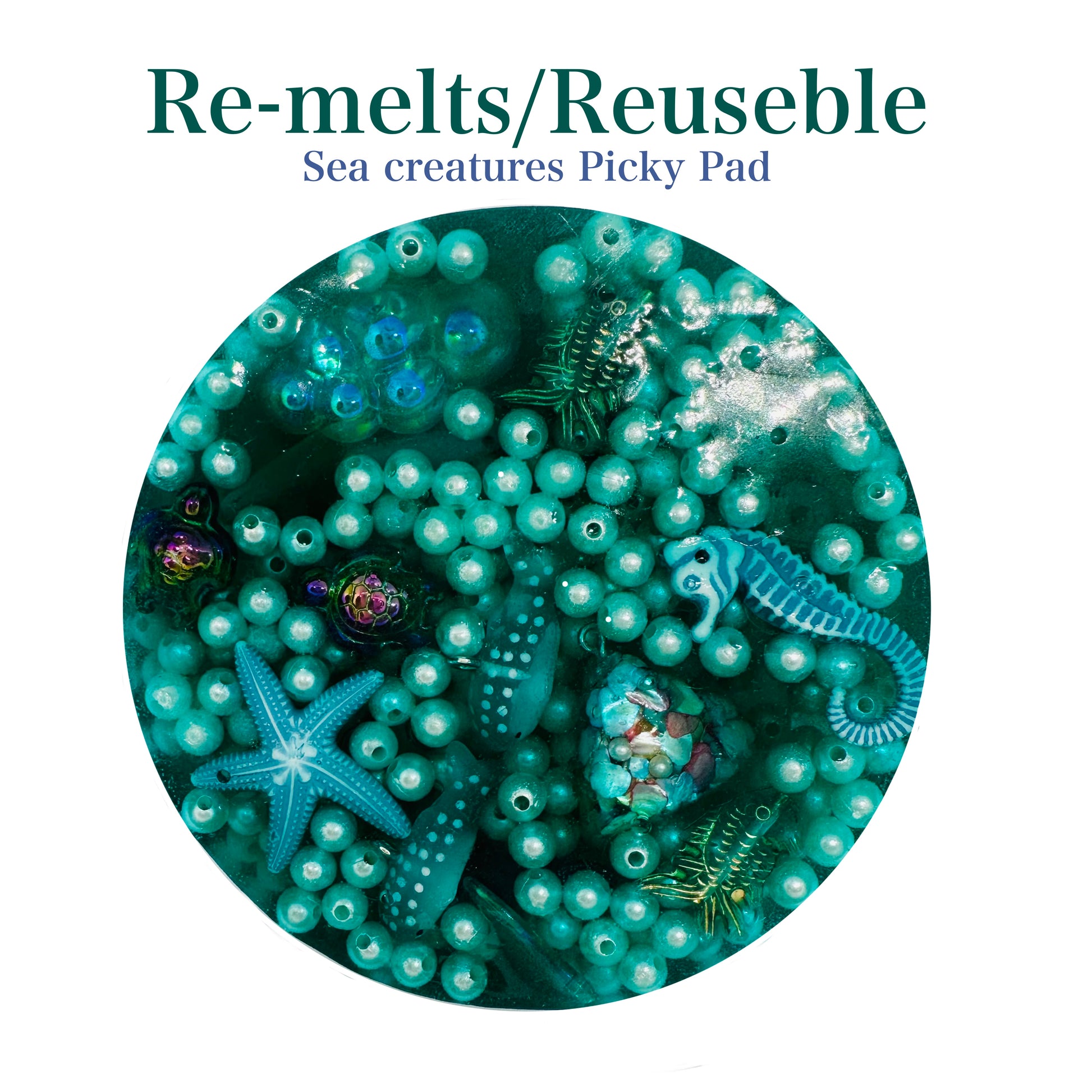 This dreamy teal, pear scented, re-meltable/reusable picky pad is like holding the ocean in your hands. Packed with pearl beads, sea creatures, and hidden treasures, its perfect for picking, making bracelets and necklaces. Its re-meltable, reusable, biodegradable, eco friendly and can be used over 100 times.